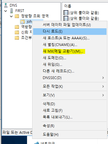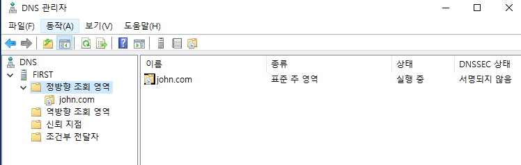 - 정방향 조회 영역 우클릭 > 새 영역 > 주 영역 > 다음 다음 해서 이름 입력 > 다음 누르다가 '동적 업데이트 허용 안 함' 선택 다음 > 마침