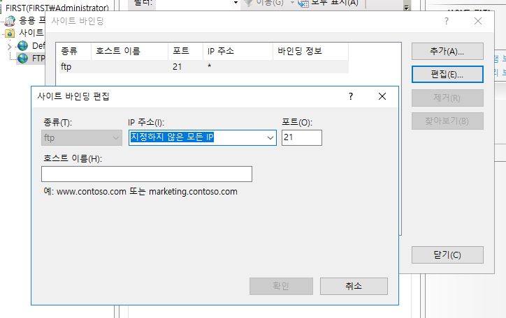 - iis에서 ftp사이트의 바인딩 편집에 들어가 호스트 이름을 빼면 웹 브라우저에서도 접근이 가능하다.