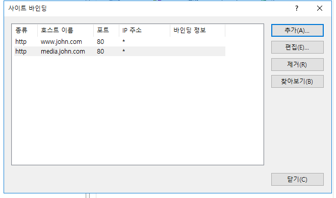 - IIS의 사이트에서 바인딩에 들어가 호스트이름을 www.john.com과 media.john.com으로 준다.