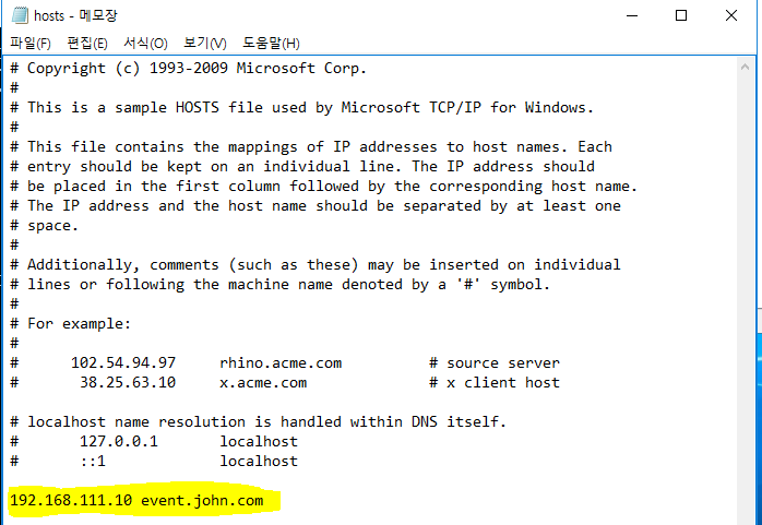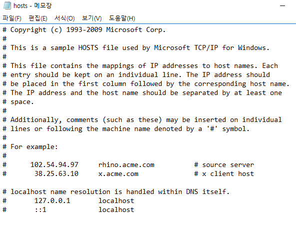 - 'C:\Windows\System32\drivers\etc'의 'hosts'파일을 수정해본다.