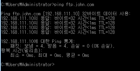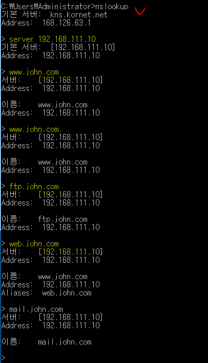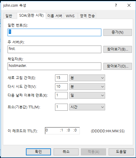 - 한줄 : nslookup -type=soa john.com 192.168.111.10