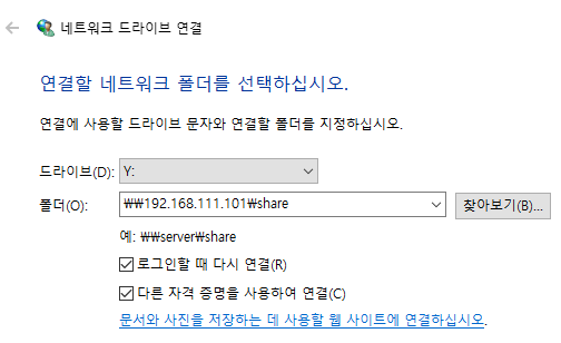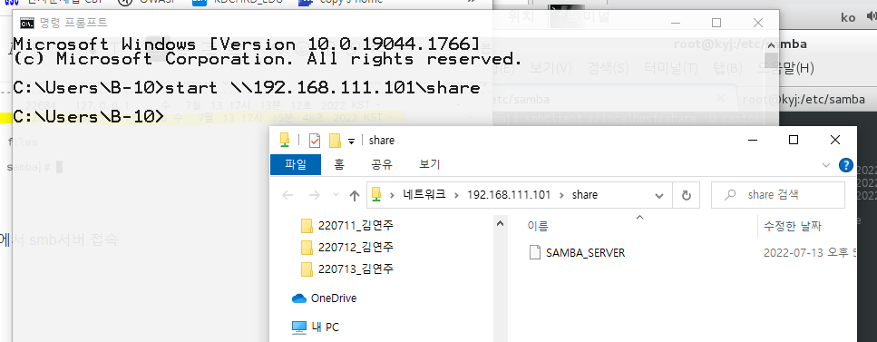 - cmd창에서 'start \\192.168.111.101\share'로 접근하면 계정정보를 입력하고 접속할 수 있다.