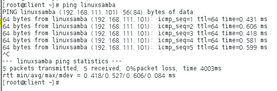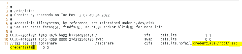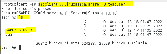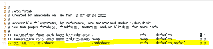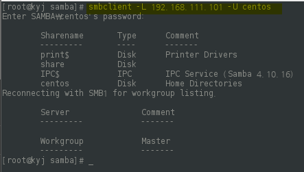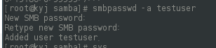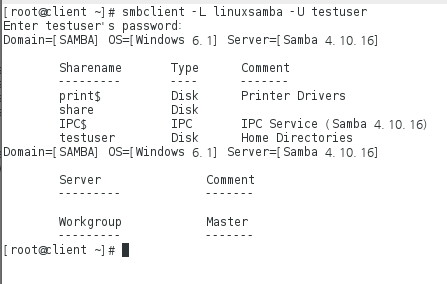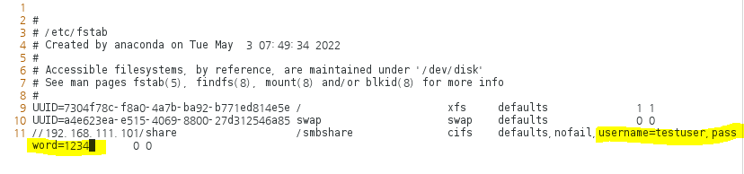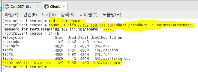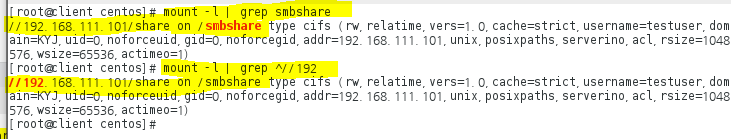 # mount -t cifs //192.168.111.101/share /smbshare -o username=testuser