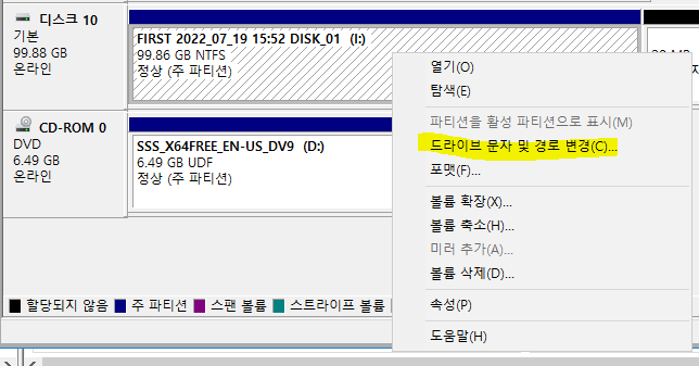 - 보이게 하려면 우클릭 > 드라이브 문자 및 경로 변경에 들어가 문자를 할당해주면 내 컴퓨터에서 확인할 수 있다.