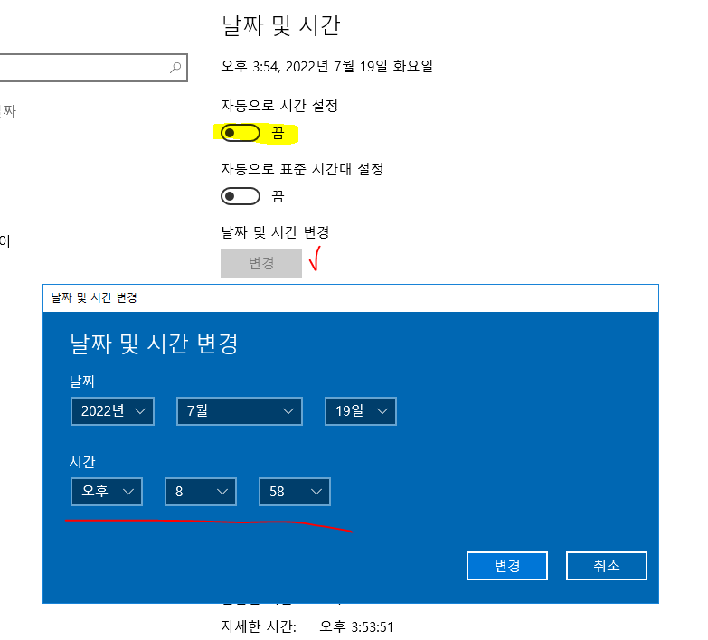 - 자동으로 시간 설정은 끄고 날짜 및 시간 변경에서 백업 시간의 1~2분 전으로 설정해본다.