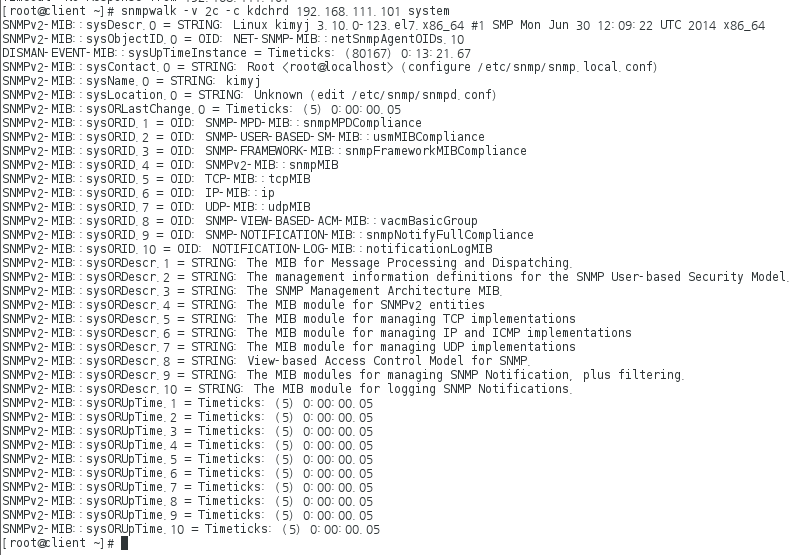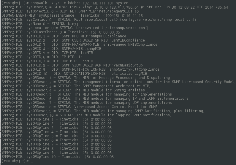 # snmpwalk -v 2c -c kdchrd 192.168.111.101 system