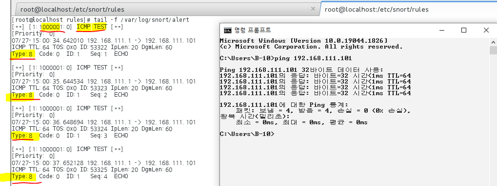 alert icmp any any -> 192.168.111.101 any (msg: "ICMP TEST"; sid: 1000001;)