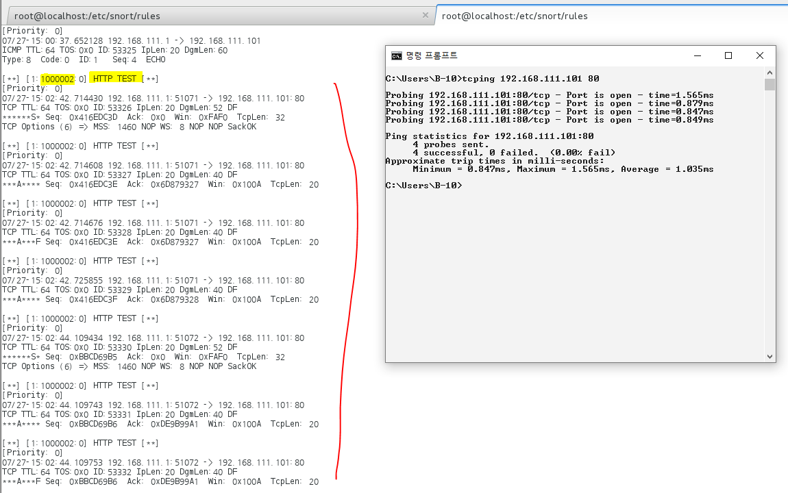 alert tcp any any -> 192.168.111.101 80 (msg: "HTTP TEST"; sid: 1000002;)