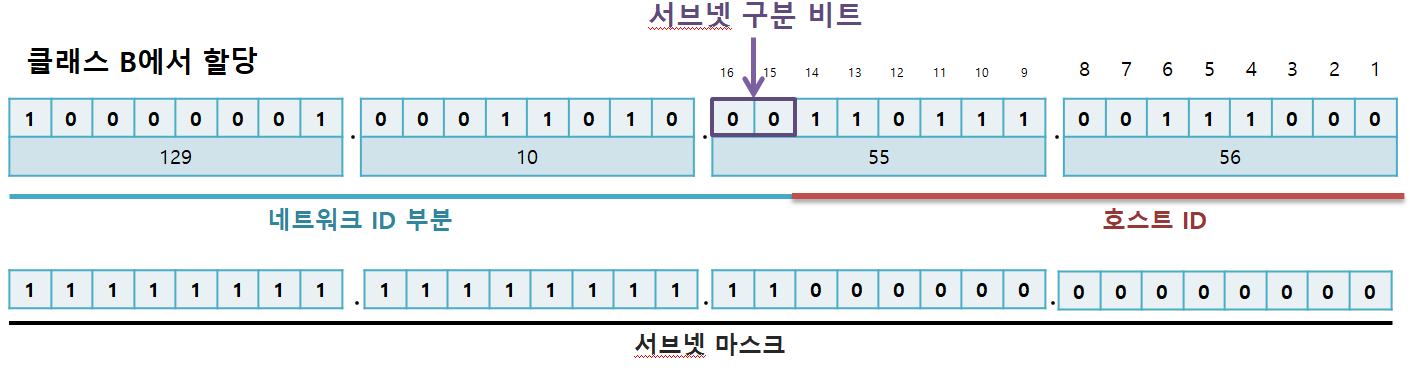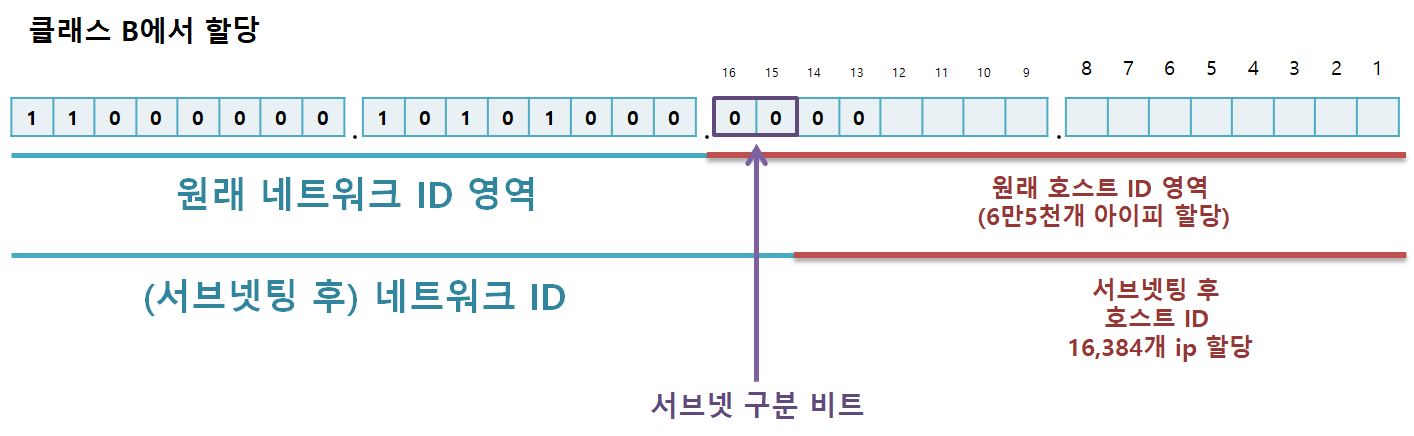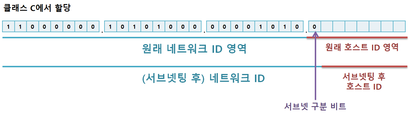 - 그림을 보면 알겠지만 몇번째 옥탯에 있는 비트자리에서 나뉘어지는가에 따라 클래스B에서 할당하는지 클래스C에서 할당하는지 알 수 있다.