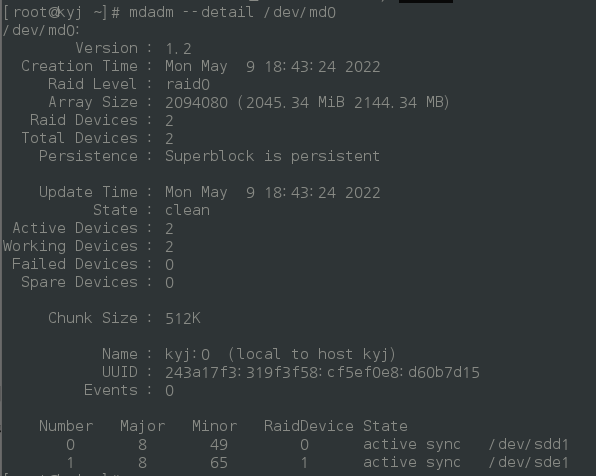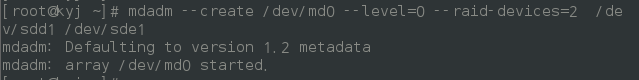 # mdadm --create /dev/md0 --level=0 --raid-devices=2 /dev/sdd1 /dev/sde1