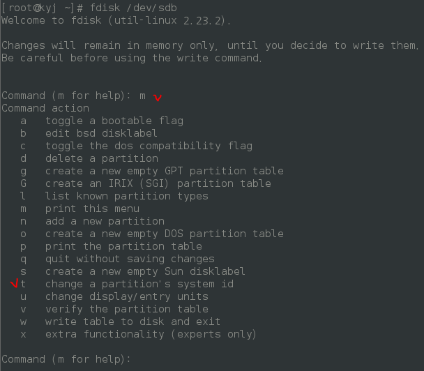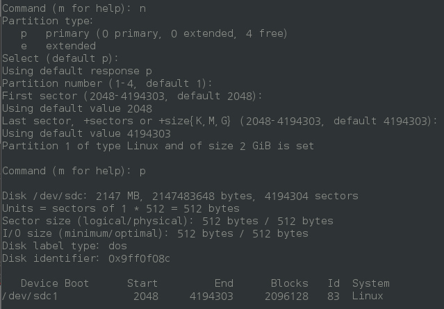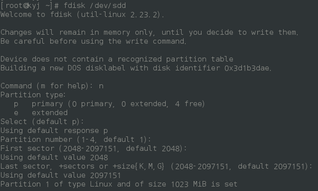 - '/dev/sdb'를 새로 파티셔닝 한다. (이때 이전에 /dev/sdb1로 포맷하였더라도 '/dev/sdb'로 진행한다.)