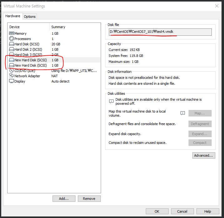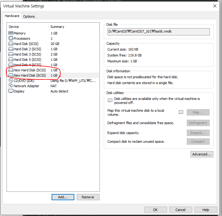 - CentOS&_101 탭 우클릭 > 세팅 > Add > 하드디스크 넥스트 > 넥스트 > 크리에이트 어쩌고 넥스트 >
