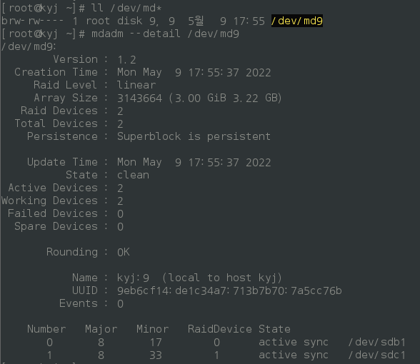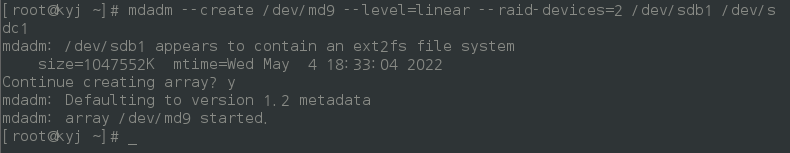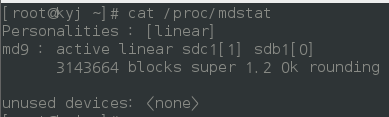 # mdadm --create /dev/md9 --level=linear --raid-devices=2 /dev/sdb1 /dev/sdc1