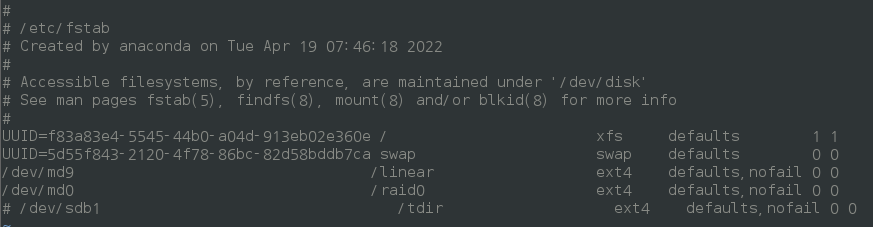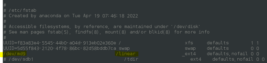 - 그리고 이제 컴퓨터를 켤때 언제든지 /dev/md9 장치가 (/linear) 디렉터리에 마운트되어 있도록 설정/etc/fstab의 파일내용을 수정해준다.