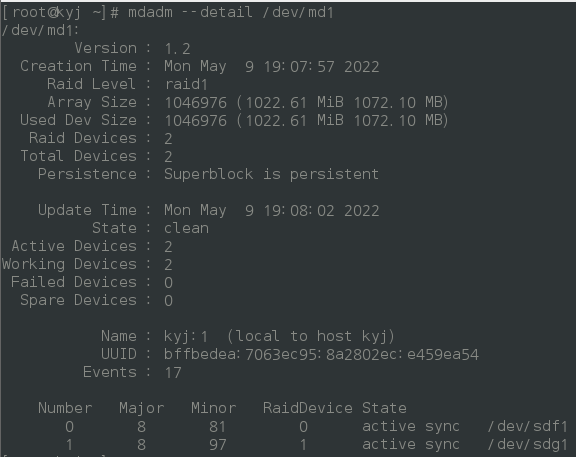 # mdadm --create /dev/md1 --level=1 --raid-devices=2 /dev/sdf1 /dev/sdg1