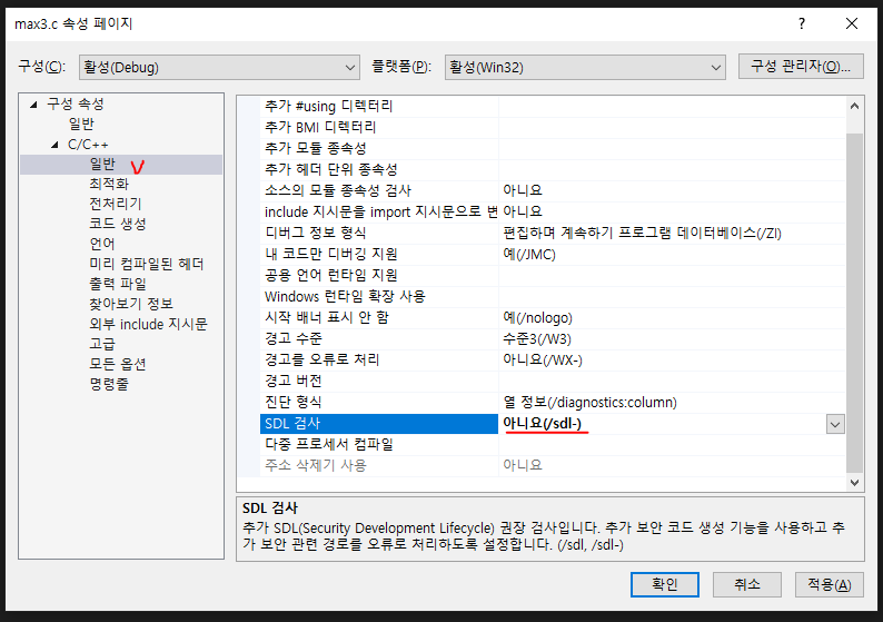 - 상단 메뉴 중 '보기 > 속성 페이지(Shift+F4) > 왼쪽의 구성속성 > C/C++ > 일반 > 왼쪽 하단의 SDL 검사' 를 '아니요(/sdl-)'로 변경