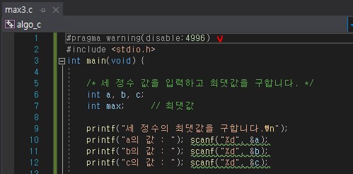 알고리즘 공부때문에 c를 다시 공부하고 있는데 비주얼 스튜디오에서 scanf가 에러라고 나온다.