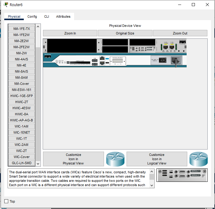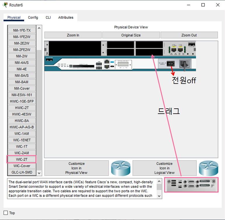(2) 그리고 왼쪽의 모듈 목록에서 'WIC-2T'를 클릭하고 우측 하단의 모듈모양을 드래그해서 위 장비의 빈 공간에 끌어다 놓는다.