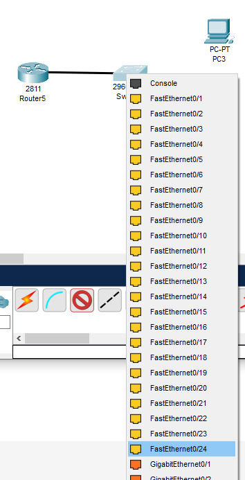 지금은 라우터와 스위치를 연결하는 것이므로 케이블을 'FastEthernet0/24'포트에 꼽았다.