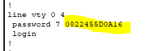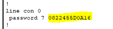 (config-line) # password 비밀번호 (비밀번호가 암호화되서 저장됨)