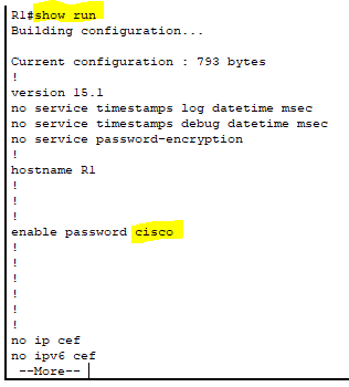 근데 위에 명령어처럼 password로 암호를 설정하면 'show run'으로 설정된 내용을 확인할때 비밀번호가 암호화가 안된모습으로 다 보인다. (비밀번호가 암호화가 안된 상태로 장비에 저장된다는 뜻)