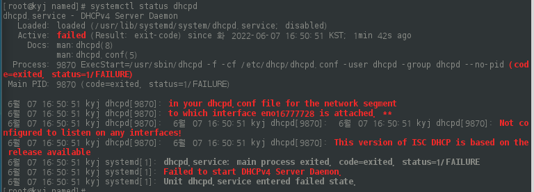 # systemctl status dhcpd로 이유를 확인해본다.