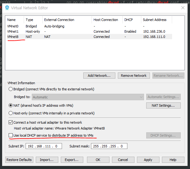 - vmware의 Edit > Virtual Network Editor > VMnet8 선택 후 'Use local DHCP' 어쩌고를 선택 해제한다.
