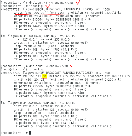 # dhclient -4 eno16777728 : 재할당