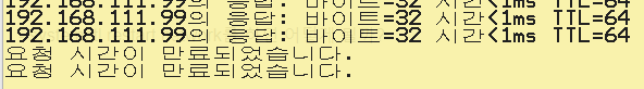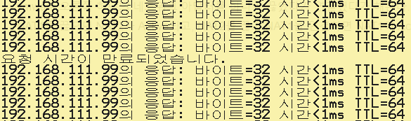 - 윈도우의 cmd에서 ping을 '192.168.111.99'에 -t옵션으로 계속 날린다.