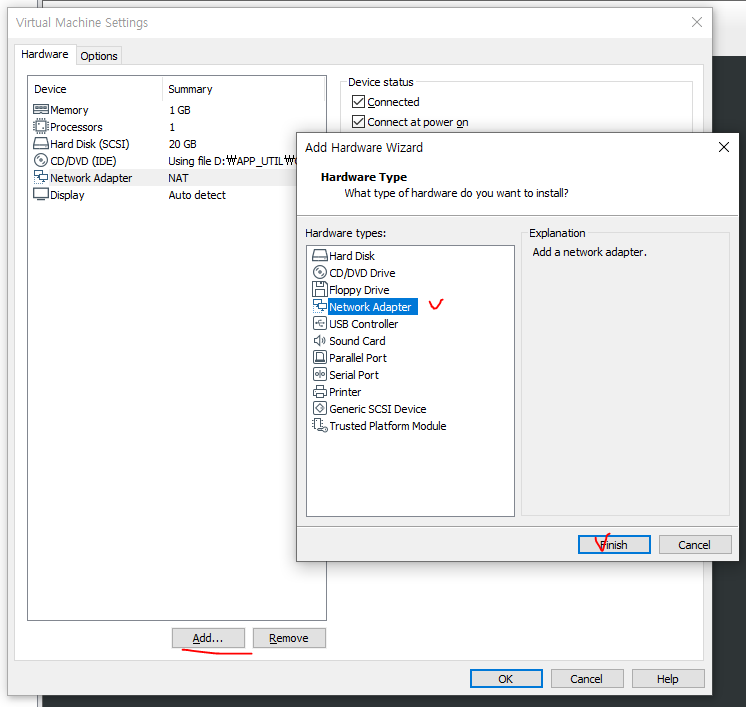 - vmware에서 서버의 세팅 > Add... > Network Adapter 선택 finish