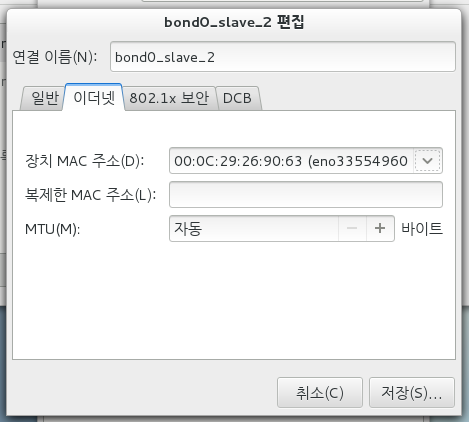 - 추가 > 연결 종류는 이더넷 > 연결이름은 bond0_slave1 > 장치 MAC주소에서 3355로 시작하는 것을 선택