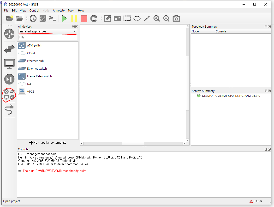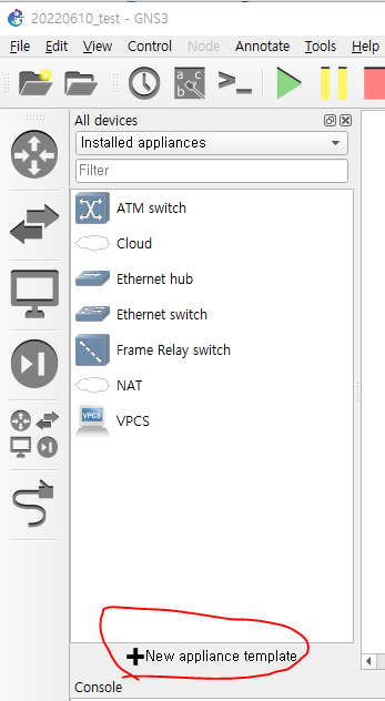 - GNS3의 아래 표시한 것을 클릭해서 추가한다.