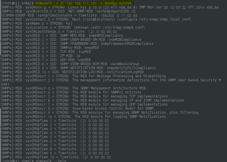 # snmpwalk -v 2c 192.168.111.101 -c monday system