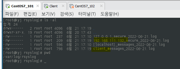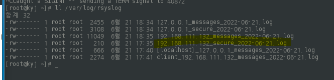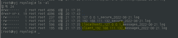 - 이후 클라이언트에서 'echo "haha" > /var/log/messages'를 해도 서버에서 확인이 안된다.