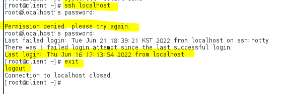 - 이제 클라이언트에서 ssh 실패도 해보고 성공도 해보고 ssh 나가기도 해보자.